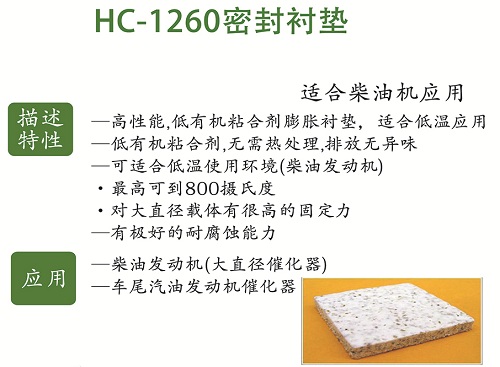 描述特性:高性能,低有機(jī)粘合劑膨脹襯墊,適合低溫應(yīng)用;低有機(jī)粘合劑,無(wú)需熱處理,排放無(wú)異味;可適合低溫使用環(huán)境(柴油發(fā)動(dòng)機(jī));最高可到800攝氏度;對(duì)大直徑載體有很高的固定力;有極好的耐腐蝕能力
